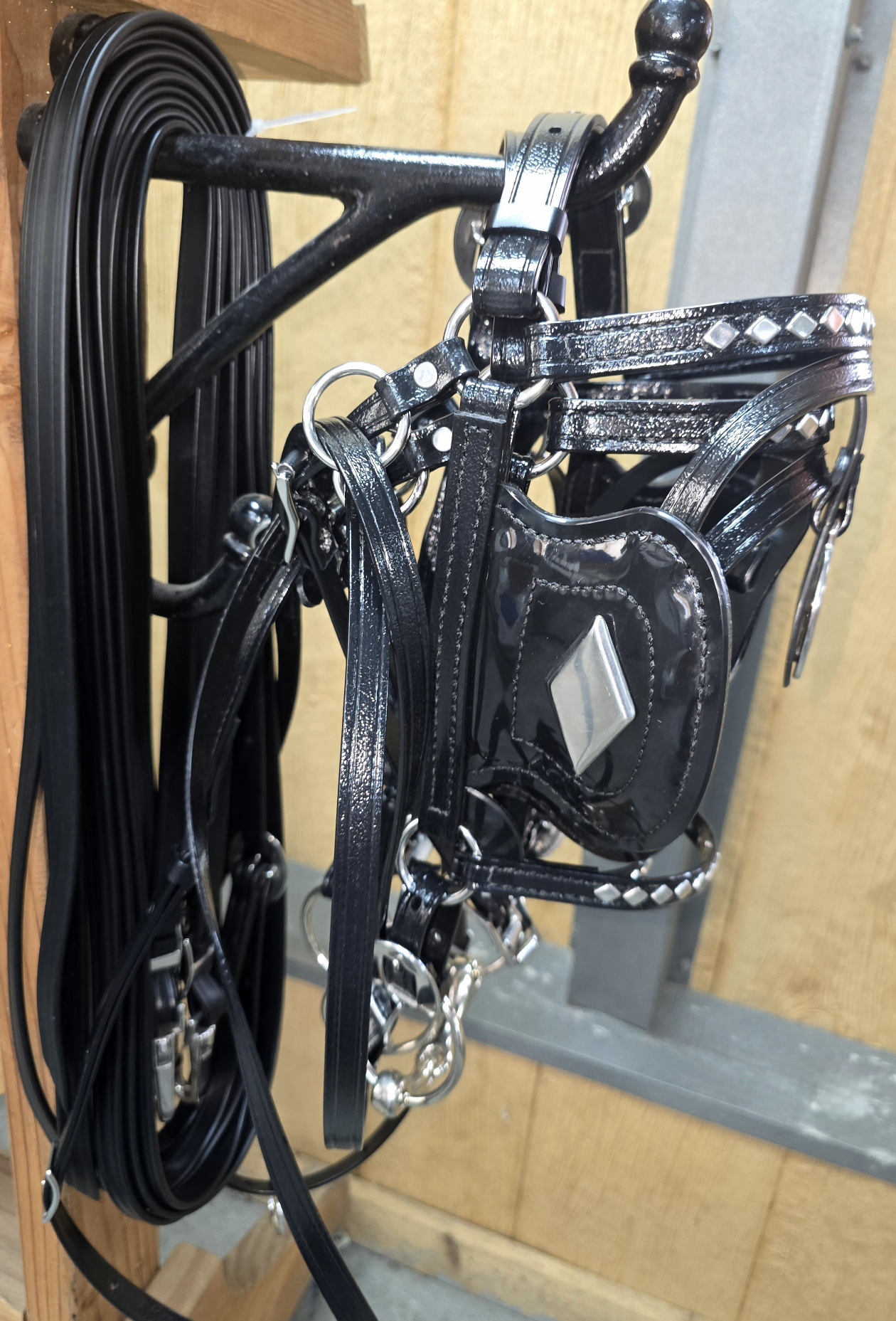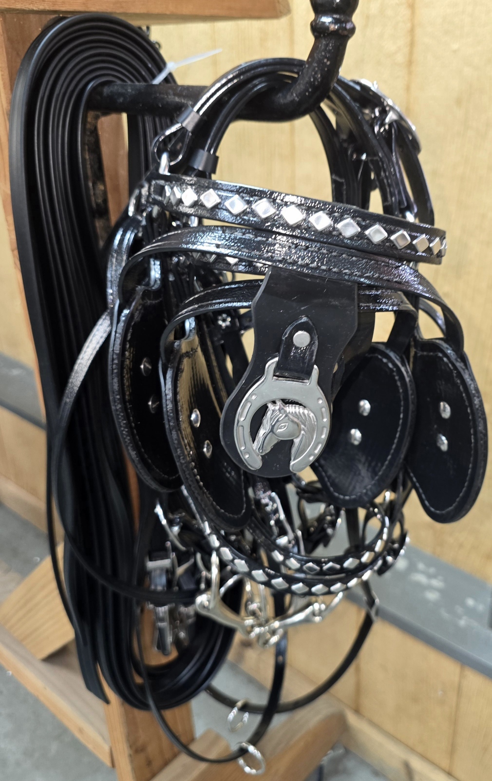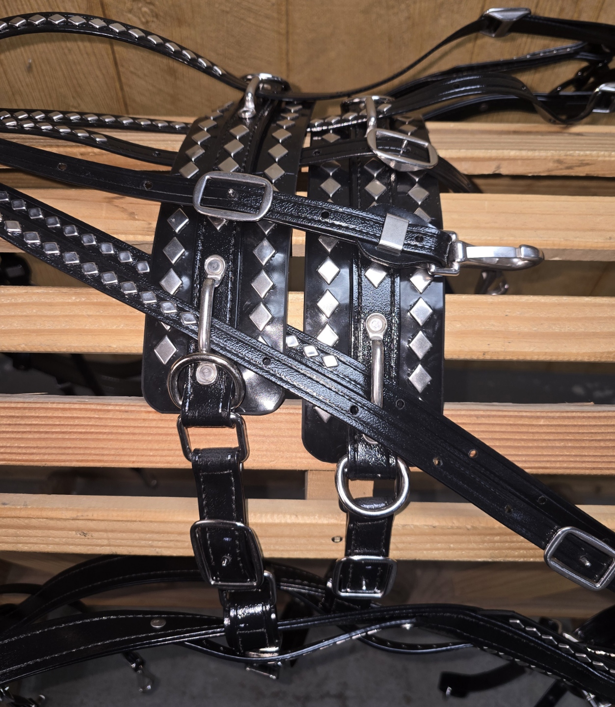 The finest mini horse parade harness money can buy – we custom designed this harness to be just like the harness used on the draft horses. Shown with optional stainless steel hames. It has your choice of hame size – standard hame size is 14″ on all of our minis. The harness is made of premium commercial grade American made bio thane or brahma webb – The harness features your choice of full diamond spots as pictured or round spots if you prefer. The harness be made in matte finish Brahma Webb. This material is 5 times stronger than leather and will not rot, mildew, absorb odors, etc – simply hose off when you are done. If they get real dirty just clean with a brush and soapy water. The harness has 3 strap breeching just like the big boys and comes with chain end traces standard. Collars and plumes are not included. Team lines and headstalls with side checks are included. Available custom sizing via call in orders only. Harness measuring chart available in “Extras” drop tab. If you need collars, please purchase them under the “Collar” shop tab.